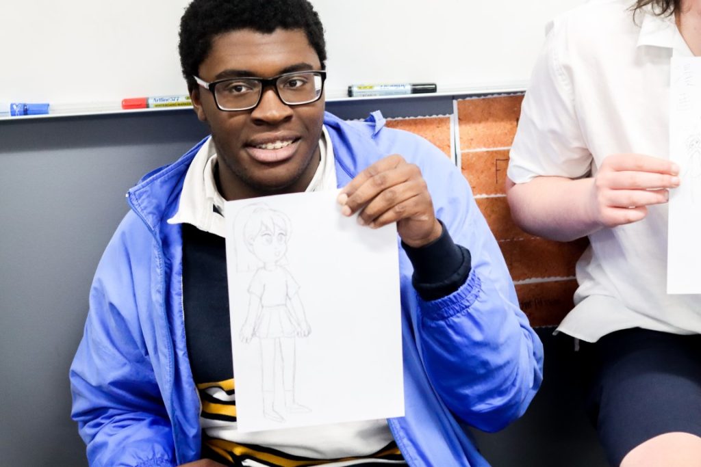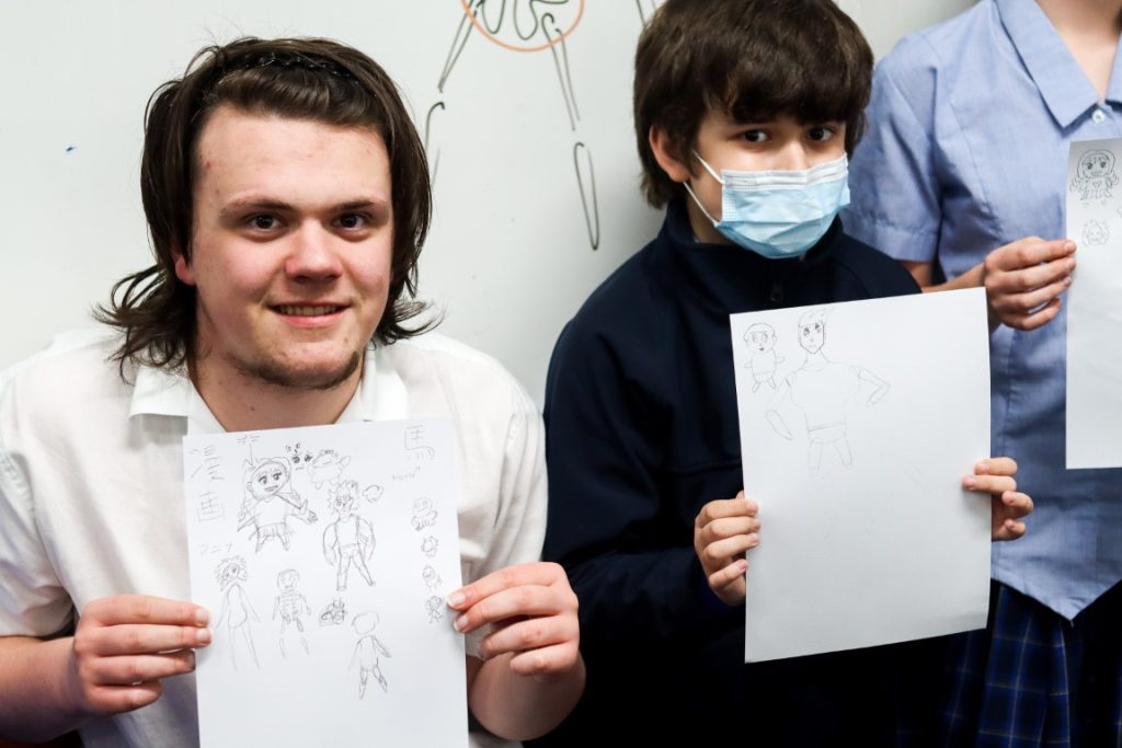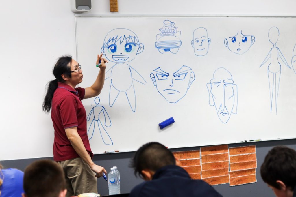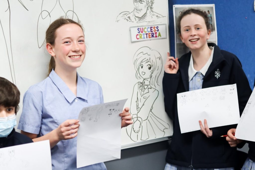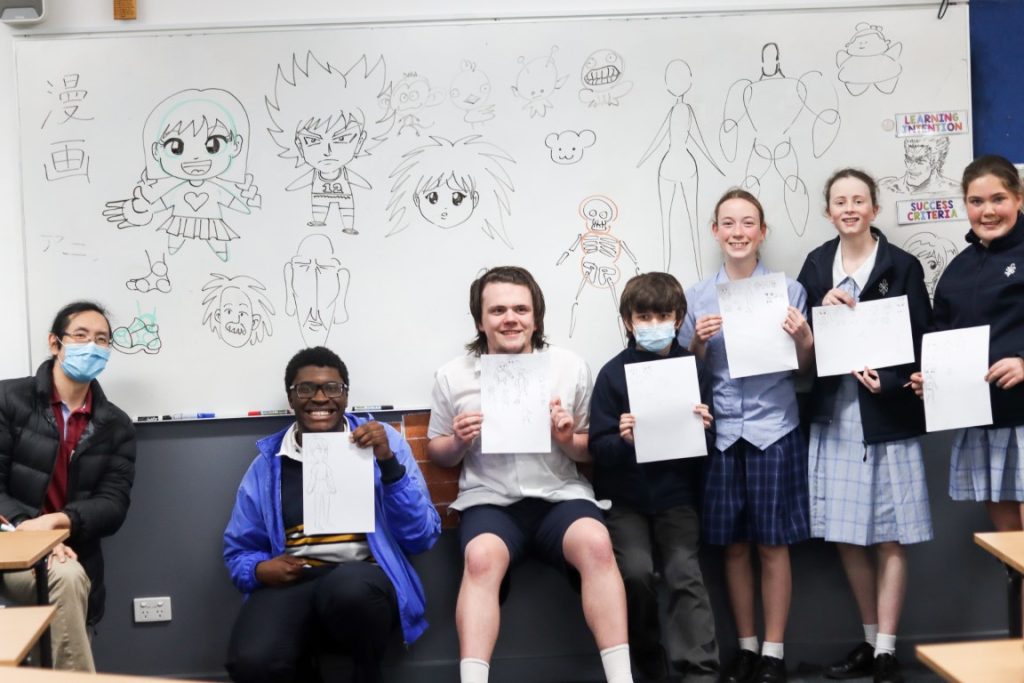 As a feature of our Year 8 Japanese program, students participated in an exciting Manga Japanese comic workshop on 29 August with Victorian-based, published, freelance Manga artist, Kenny Chan. Our students enjoyed Kenny Chan’s very immersive artistic workshop and his entertaining visual demonstrations of what changing visual features can do to imbue characters with personality and emotion. We learnt that a long nose could add age to a character, that the eyes are where humans focus most, which means that manga characters usually feature large, expressive eyes, but have less detail for other facial features. We learnt that a smaller head could create bulk in a character’s appearance and that a louder or quieter character would have a larger or smaller mouth respectively. We learnt to reverse capital C and J together and in reverse to create instant ears on a character and that drawing is as simple as potato and carrot shapes!
