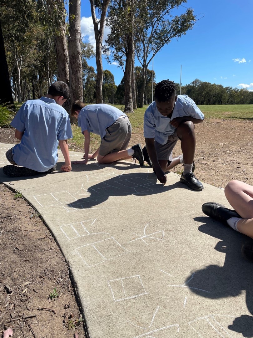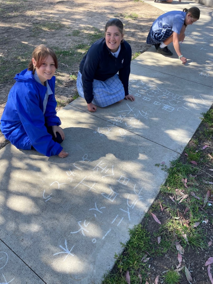 This week’s classes also enjoyed a blue sky classroom, practicing their Japanese characters with invisible ink before going outside to decorate the paths around SFX with chalk drawn characters to consolidate their kanji learning.