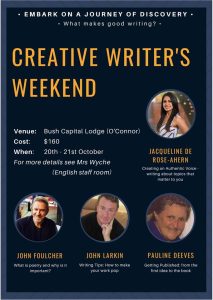 The SFXC English department is excited to announce that a Creative Writers’ Weekend will be run on October 20 and 21. (End of Week 1 in Term 4) This inexpensive overnight excursion (being held in Canberra) is open to all students in years 9 – 12.