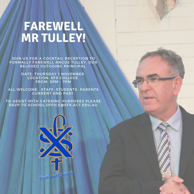 All staff, students, parents and alumni of St Francis Xavier College, Florey are invited to farewell Mr. Angus Tulley, who finished as Principal of the College this year.