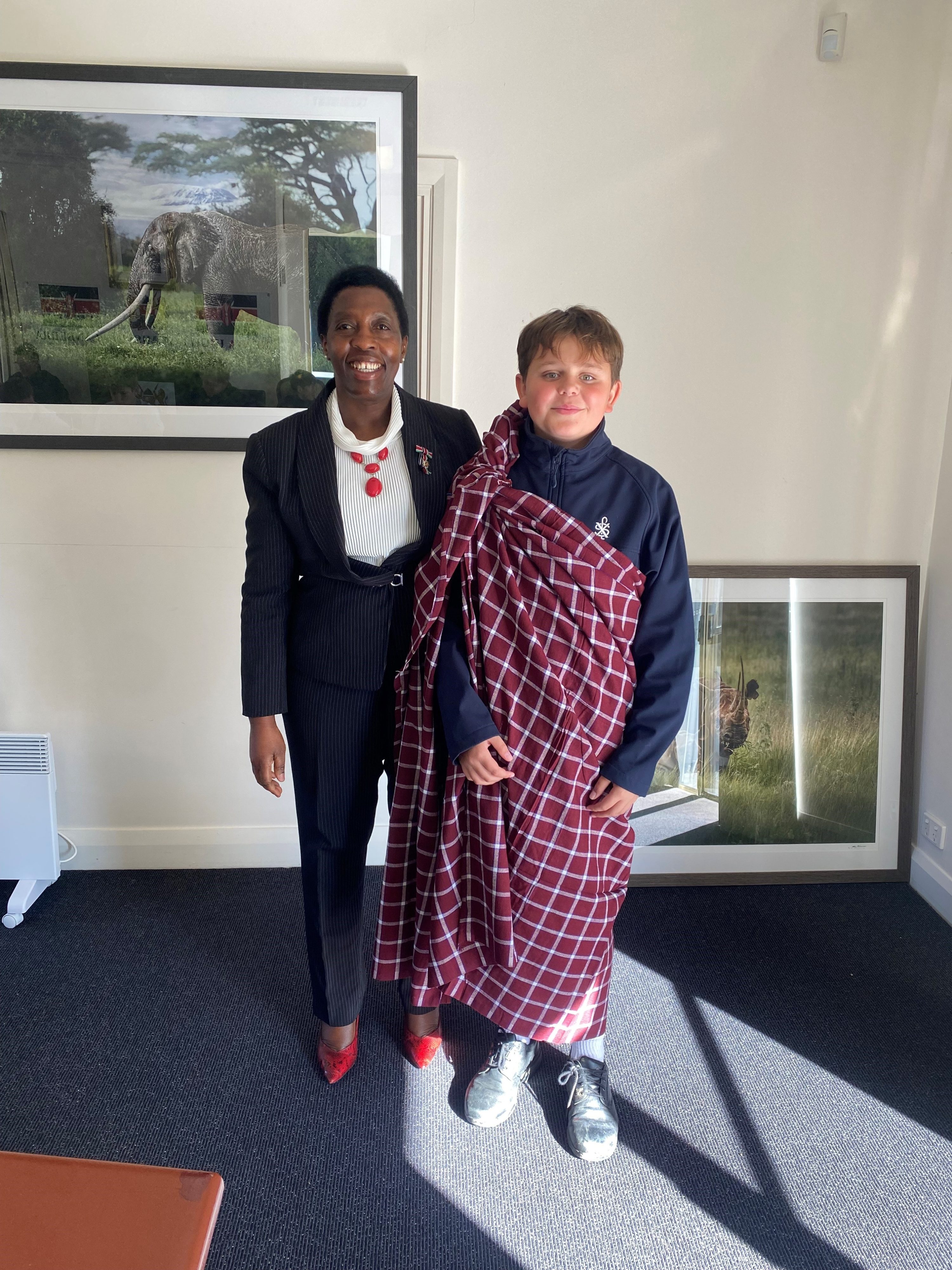 One of the highlights of our visit was learning about the Kanga, a traditional Kenyan garment. One student volunteered to be the model while Flora showed us how it was worn. Kindly, this Kanga was gifted to the College. The High Commission graciously organised morning tea and the students felt very important drinking Kenyan tea in the Boardroom.