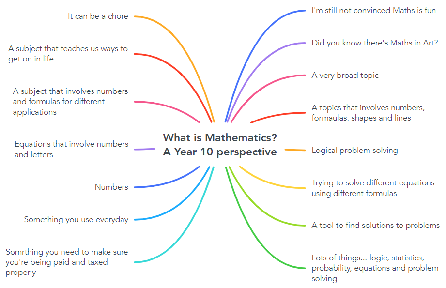 Last term during our Open Day we invited our prospective Year 7 students to answer the question ‘What is Mathematics’. Their responses were delightful and insightful, ranging from difficult or fun, to patterns and problem-solving. This has prompted us to examine the difference in the perception of Mathematics from Year 7 to Year 10. We posed the same question to our current Year 10 students and found that while some of them still see Maths as a bit of a chore, they recognise its importance in problem solving, its connection to other subject areas and its importance in everyday life.