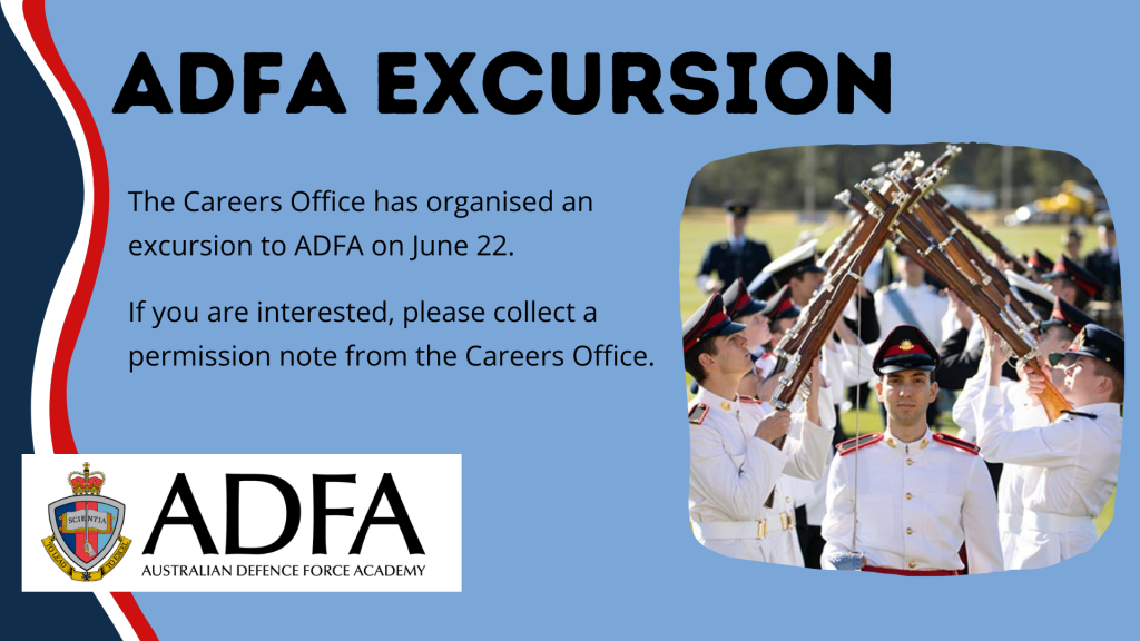 There is an excursion to ADFA for any interested Year 10, 11 and 12 students on Wednesday 22 June 2022 from 8.30am-12.30pm. The guided tour will allow time to ask questions about the many opportunities at ADFA. Permission forms are available from the VET and Careers office and places are limited. Permission forms are due back on June 8—no late notes will be accepted.