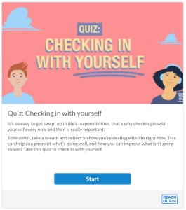 Here’s a fun and helpful little tool from ReachOut . Take the ‘Checking in with yourself quiz’ for teens to help you reflect on how you are feeling and figure out what to do next: